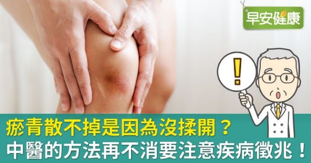 如果3、4個月瘀青都沒消,建議民眾熱敷並加以輕柔按摩。假如數天後未見改善,則建議就醫,了解是否傷及深層組織或骨頭,或是否可能有其他健康問題,如紫斑症或其他血液疾病。