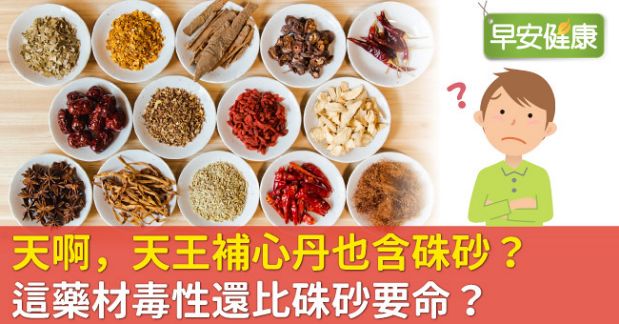 其實在中藥材裡,有許多安全的藥物,足以取代硃砂的鎮靜安神作用,所以目前的天王補心丹當然也不含硃砂,天王補心丹古方確實有含硃砂,主要成分包含天門冬、人參、茯苓、玄參、丹參、遠志、桔梗、當歸、五味子、麥門冬、柏子仁、酸棗仁、生地黃,重點是用硃砂為衣,臨臥時用竹葉湯服,但是現代的科學中藥早就將硃砂去除,所以目前廣泛的用在神經衰弱、精神官能症、更年期綜合症等,其效果也非常的好,當然現在用的天王補心丹也不含硃砂。
