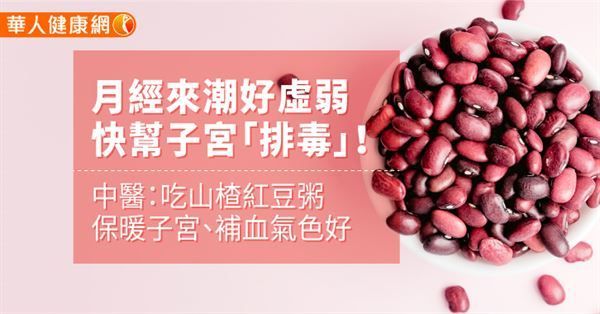 山楂有助通經化瘀,也可以排出體內廢物,使子宮更健康,就能達到疏通體內氣血,緩解痛經的效果。建議月經開始第一、二天開始吃山楂,有很好的暖子宮和滋養卵巢的效果。而月經來潮時,會損失血液中的血漿蛋白、鐵、鉀、鈣、鎂等物質。但是,紅豆含有豐富的鐵質,能讓人氣色紅潤,多攝取紅豆,還有助補血、促進血液循環。如果再加上紅棗,更能強化活力。