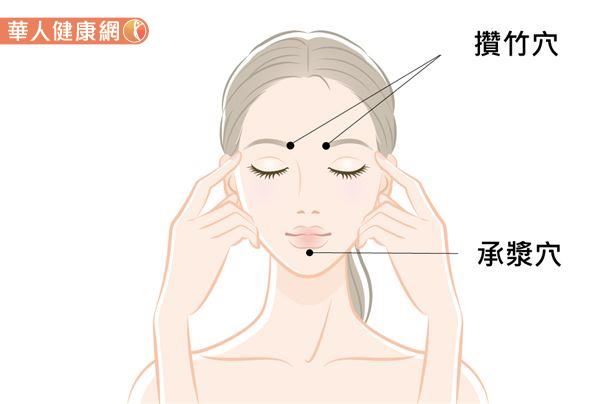 位於嘴唇與下巴中間的凹陷處,屬於任脈的穴道,顧名思義是可承接口中的水漿,具有生津歛液的作用。每次按揉持續5秒鐘後放開休息,再重複動作直至乾澀感覺緩解。