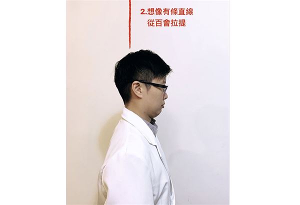 2.想像一根線吊著頭頂百會穴維持中心點,向上拉提頸椎。