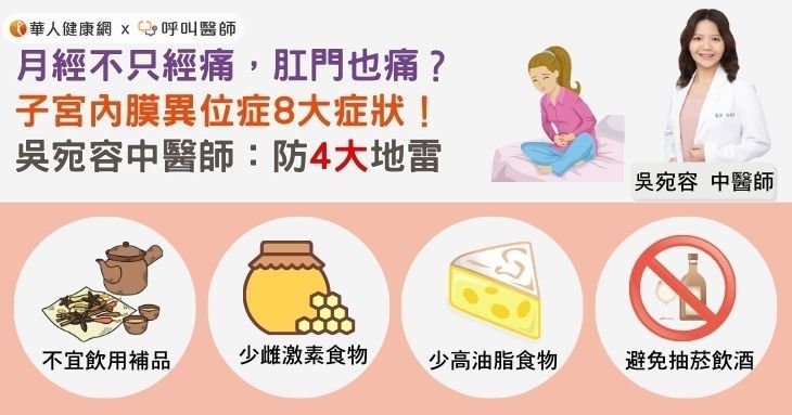 經期肛門痛,不僅是普通經痛,可能是子宮內膜異位症的警訊!中醫師吳宛容提醒,當月經來潮出現肛門疼痛、骨盆腔痛等症狀,應特別注意是否有子宮內膜異位的問題。