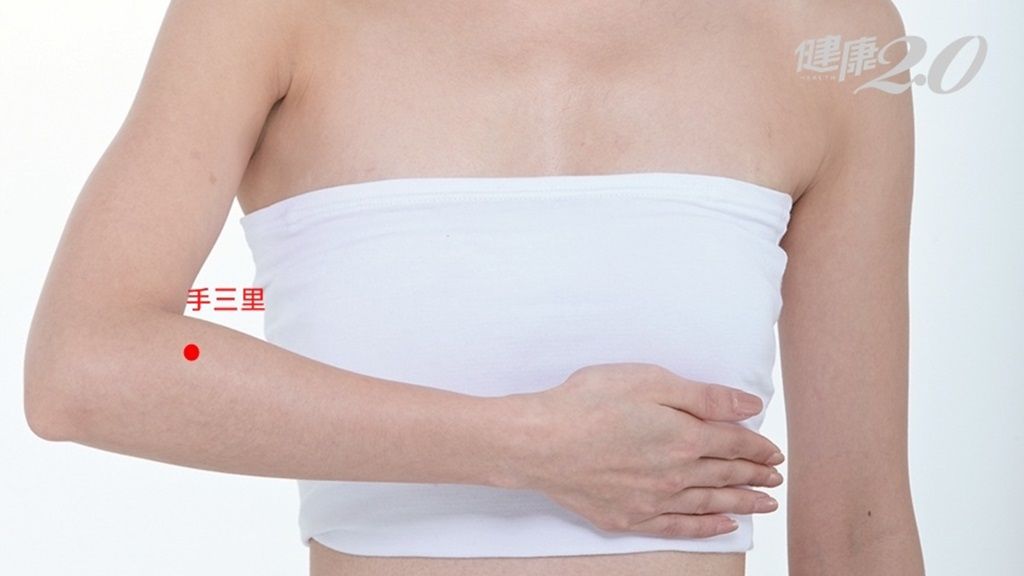 手三里穴:位於慣用手肘部,肘橫紋外側尾端往下三指寬、肌肉豐厚處。按壓約30下後,肩頸活動會感覺明顯放鬆。