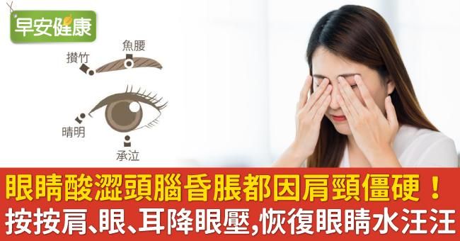 眼睛乾澀、酸澀疲勞,常與肝經、腎經失調有關。長時間用眼過度、熬夜、睡眠不足等習慣,會導致肝火旺盛、腎水虧虛,進而出現眼睛不適。而肩頸僵硬會壓迫頭部循環,導致血液回流不順,連帶造成頭壓升高、眼壓上升、眼部循環不良,最終出現頭昏、頭脹、耳鳴、視覺模糊等問題。