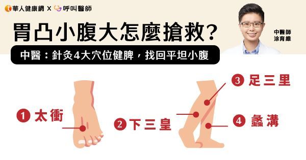 最後,涂育維中醫師提醒,胃凸的形成並不是一朝一夕的,所以治療上除了用藥針灸外,患者本身的生活習慣也需要進行調整,除了要減少暴飲暴食、吃到飽,也要調整吃太快的習慣,並盡量減少烤炸辣等對腸胃負擔較大的食物。革除不好的生活習慣外,也推薦偶爾練習腹式呼吸幫助放鬆情緒,並且加入鍛鍊核心肌群的動作,像是死蟲式、橋式等簡單又不會出錯的動作,幫助大家盡快消除胃凸,還可以建立更好的體態。