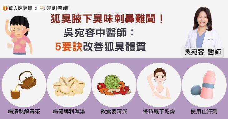 吳宛容中醫師指出,治療狐臭重點在於「清熱祛濕」。濕熱性體質的人平時應避免辛辣、油膩及冰冷食物,應多食用健脾化濕食材,如薏仁、茯苓、荷葉等。