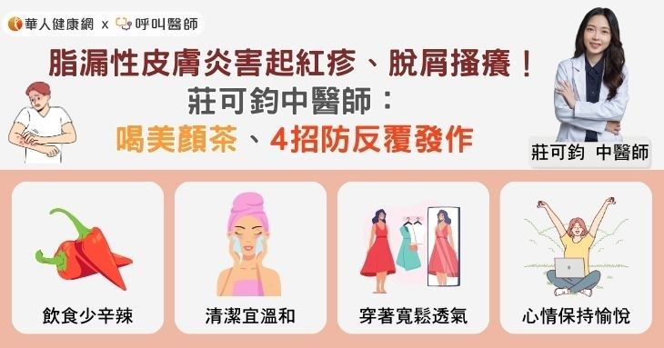 莊可鈞中醫師表示,脂漏性皮膚炎在中醫稱作「面遊風」或「白屑風」,《外科正宗》:「白屑風多生於頭、面、耳、項髮中,初起微癢,久則漸生白屑,疊疊飛起,脫之又生。此皆起於熱體當風,風熱所化。」 而多處搔癢也符合中醫「風」善行數變的特性,而風邪又消耗體內津液,導致乾燥脫屑。