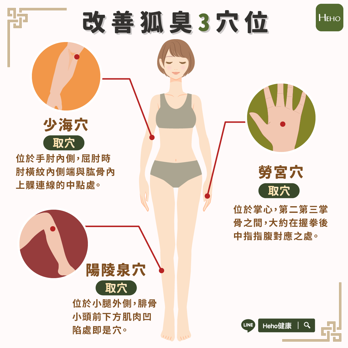 腋下為多條經絡交會處,包括心經、心包經、膽經。可選用以下穴位針灸或按摩,有助於排濕止汗、安神降火: